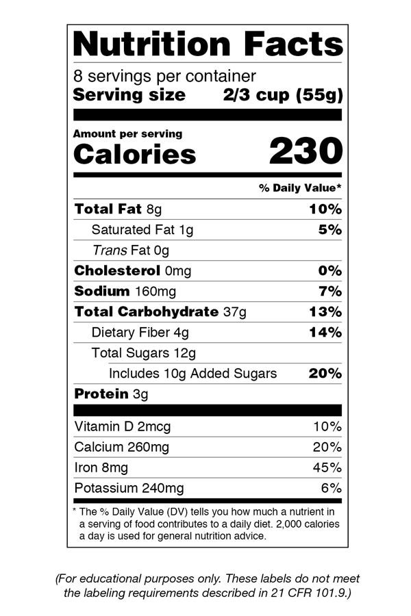 Food Labels: Fat & Cholesterol | Home & Garden Information Center The 2015 Dietary Guidelines for Americans recommends the following intakes of fat and cholesterol every day: total fat—20 to 35% of calories, depending on age and gender (65 grams for the 2,000-calorie intake level used in the Daily Value)*. saturated fat—less than 10% of calories**. trans fat— keep as low as possible. Nutrition Facts table formats - Food labels - Canadian Food … Although the Food and Drug Regulations (FDR) require the declaration of a Nutrition Facts table (NFt) on most prepackaged products, the information may be presented in a variety of different formats. Industry has considerable flexibility in presentation, and may choose from several different format "families". Within each format family, further choices of presentation style are …