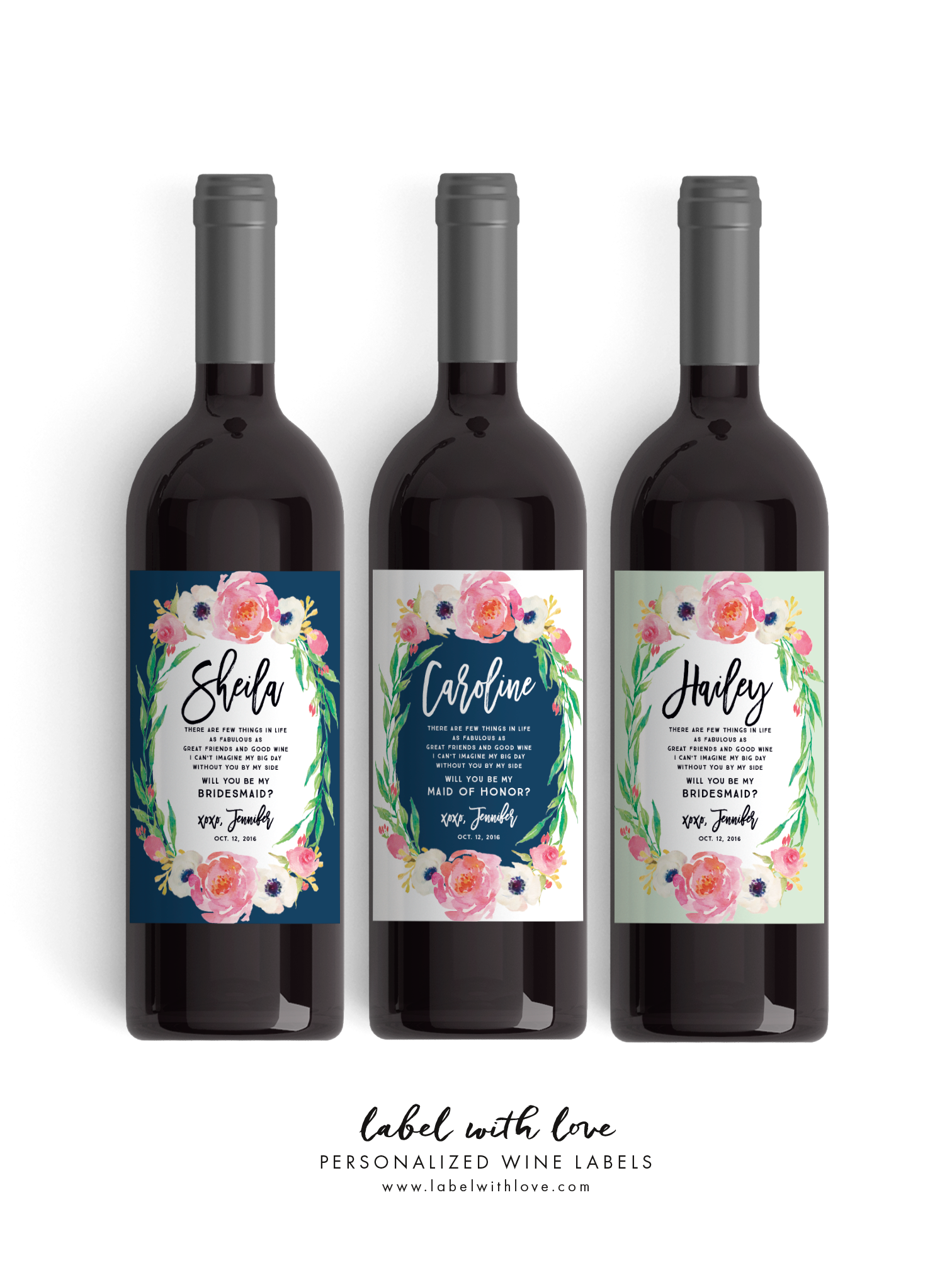 15 Best Bridesmaid Wine Labels - Bridesmaid Gifts Boutique A Girl's Best Friend from $9.99. Pastel Pink Sold Out. Pink and Gray Wine Label Sold Out. Delicate Flower from $24.99. Bright Light Wine Label from $24.99. XOXO Sold Out. Jailbird Wine Label Sold Out. Looking for a unique and fun way to ask your bridesmaids 'will you be my bridesmaid' or maybe just to say 'thank you for being my bridesmaid ...